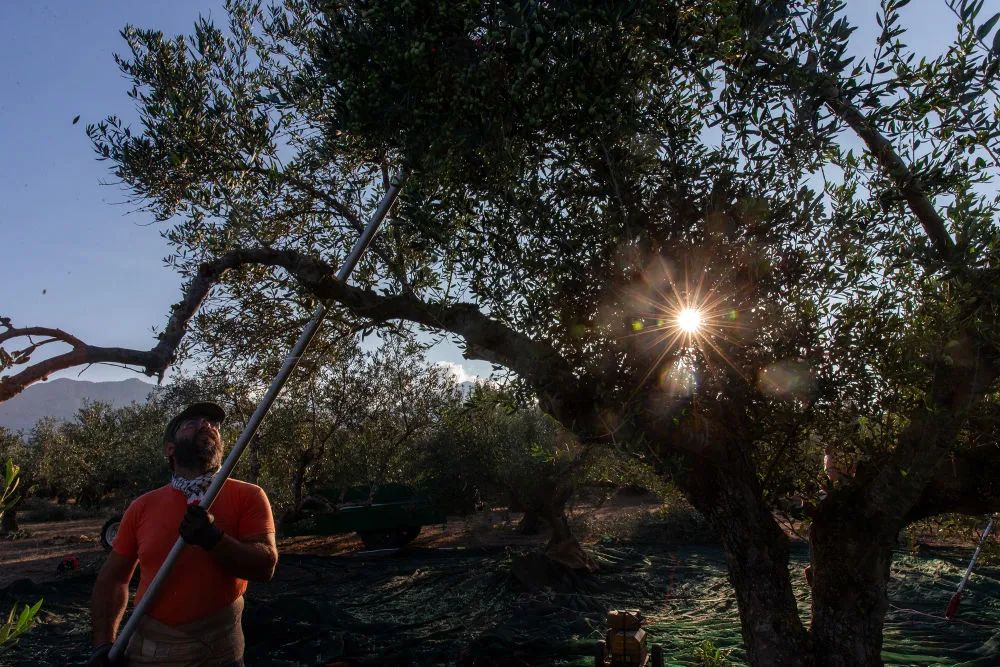 ↑一名男子在希臘伯羅奔尼撒半島麥西尼亞收獲油橄欖。