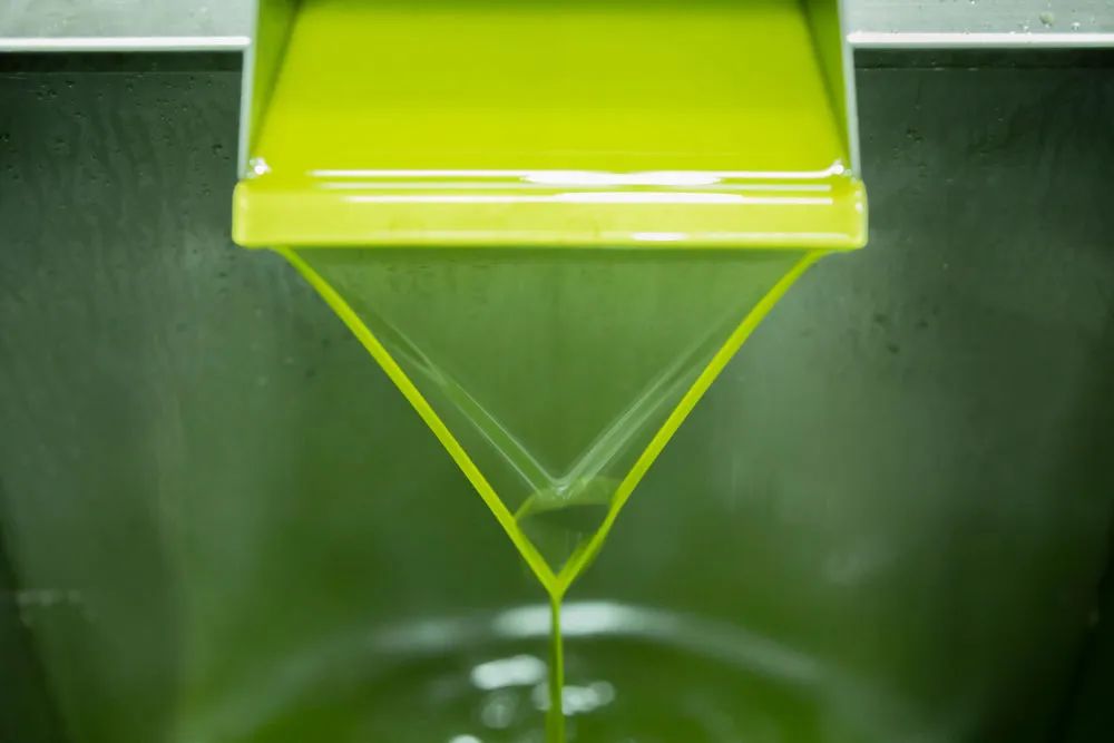 ↑在甘肅省隴南市武都區(qū)一家油橄欖加工企業(yè),一股特級鮮榨橄欖油正在流出。