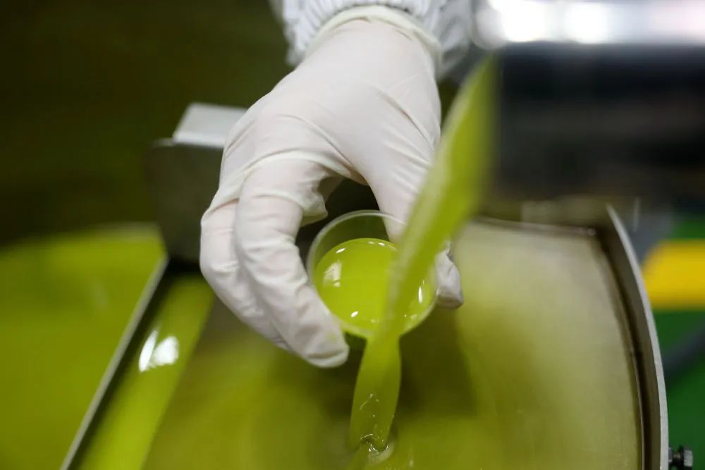 ↑在甘肅省隴南市武都區(qū)一家油橄欖加工企業(yè),工作人員查看初榨橄欖油品質(zhì)。