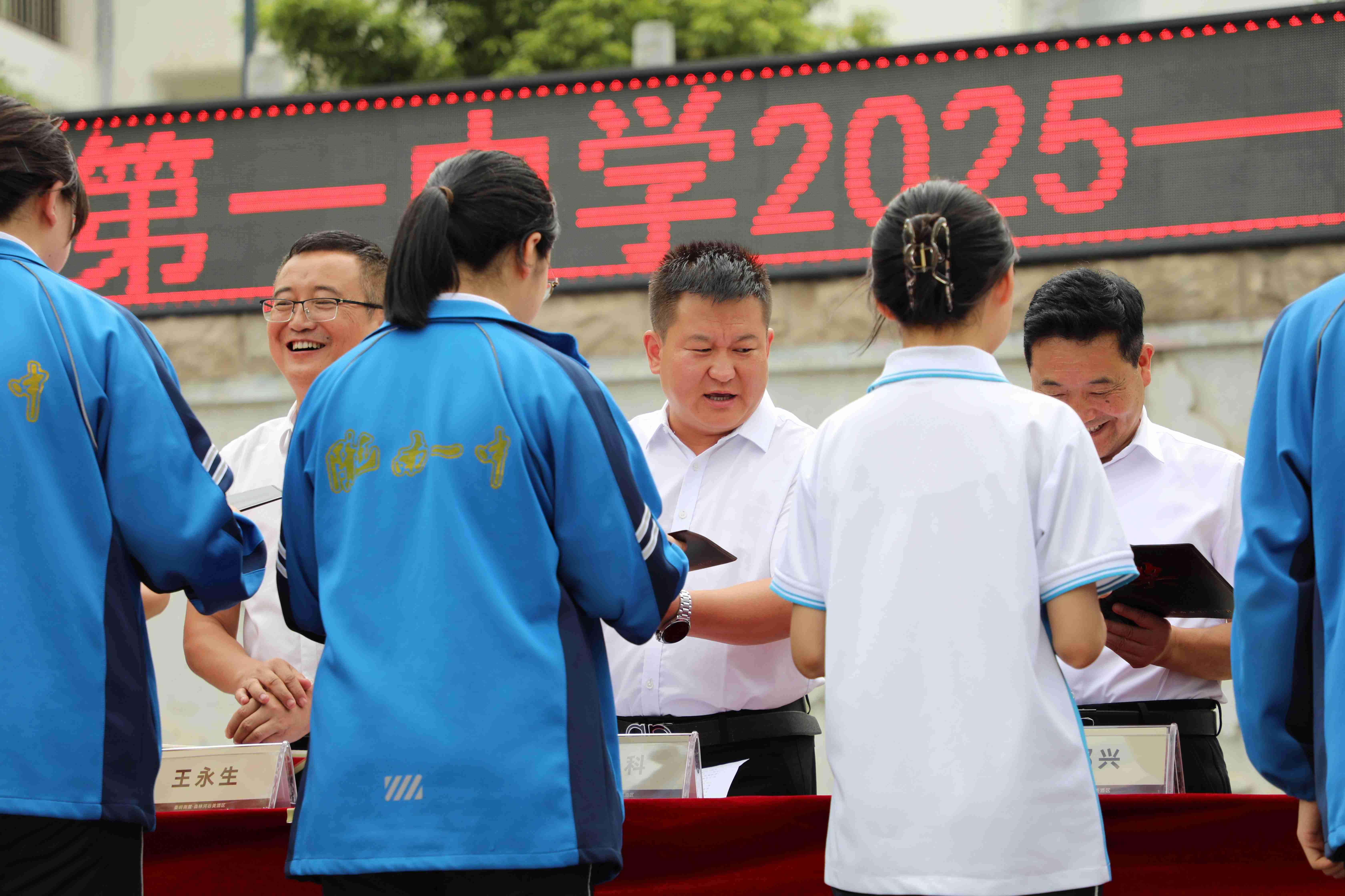 獲獎同學(xué)與家長一同走上領(lǐng)獎臺,從校領(lǐng)導(dǎo)和李總手中接過獎牌與榮譽證書,臉上洋溢著自豪與喜悅。
